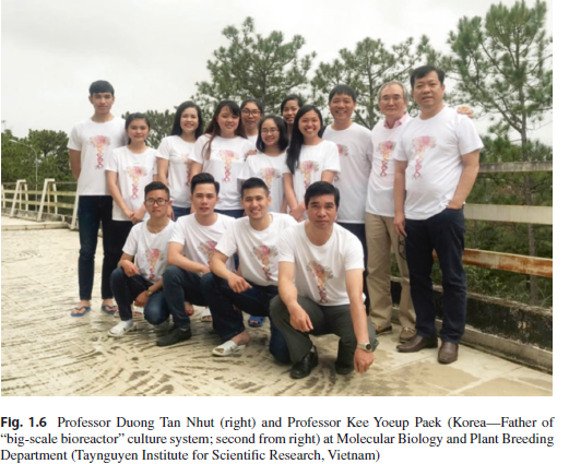 'Undeniable Positive Impacts of Metal Nanoparticles in Plant Tissue Culture'에 Fig. 1.6 Professor Duong Tan Nhut (right) and Professor Kee Yoeup Paek (Korea—Father of “big-scale bioreactor” culture system; second from right) at Molecular Biology and Plant Breeding Department (Taynguyen Institute for Scientific Research, Vietnam)